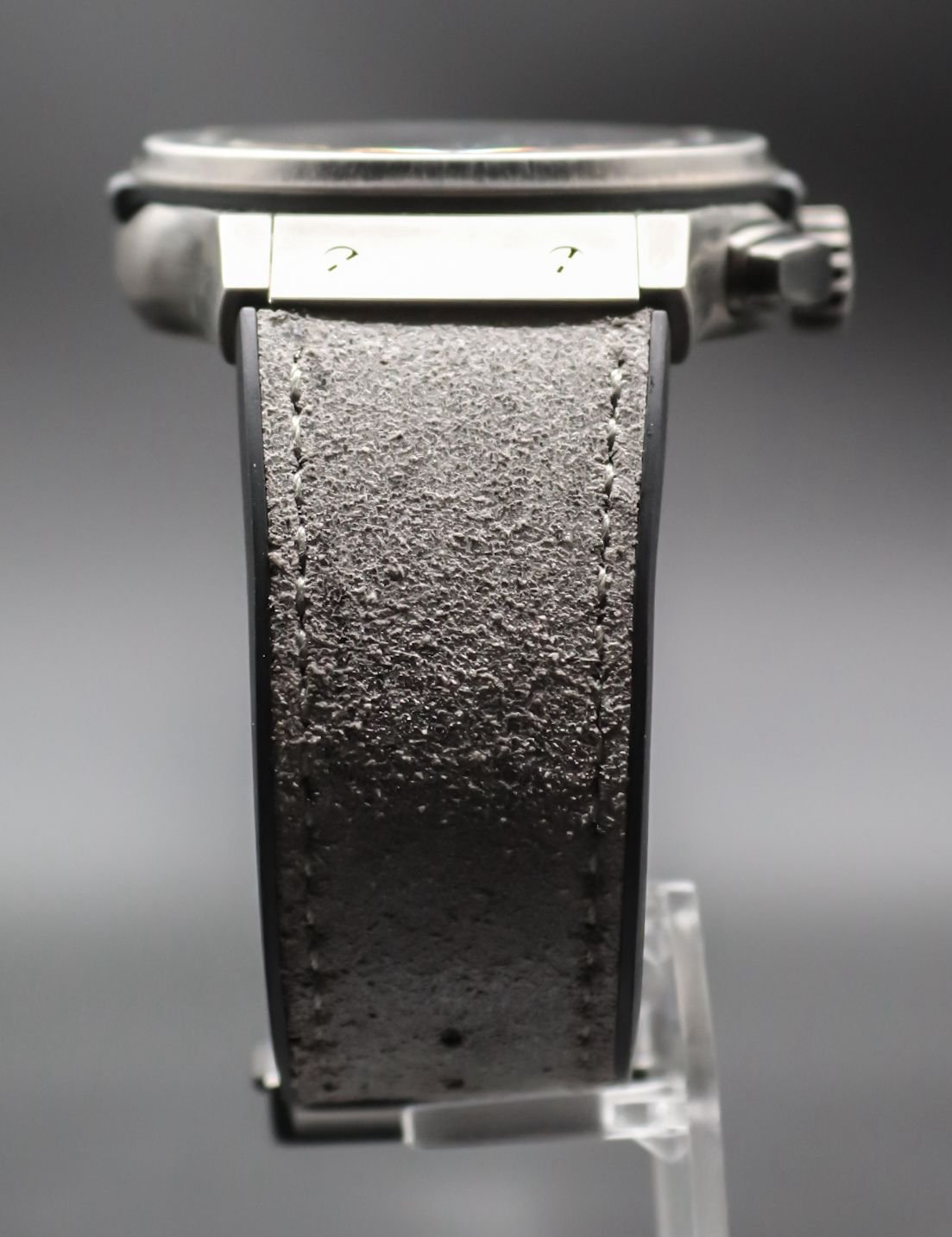 The brushed black titanium of the 45-mm case and bezel with a slightly aged effect is an ulterior tribute to the age-old history of Rome.