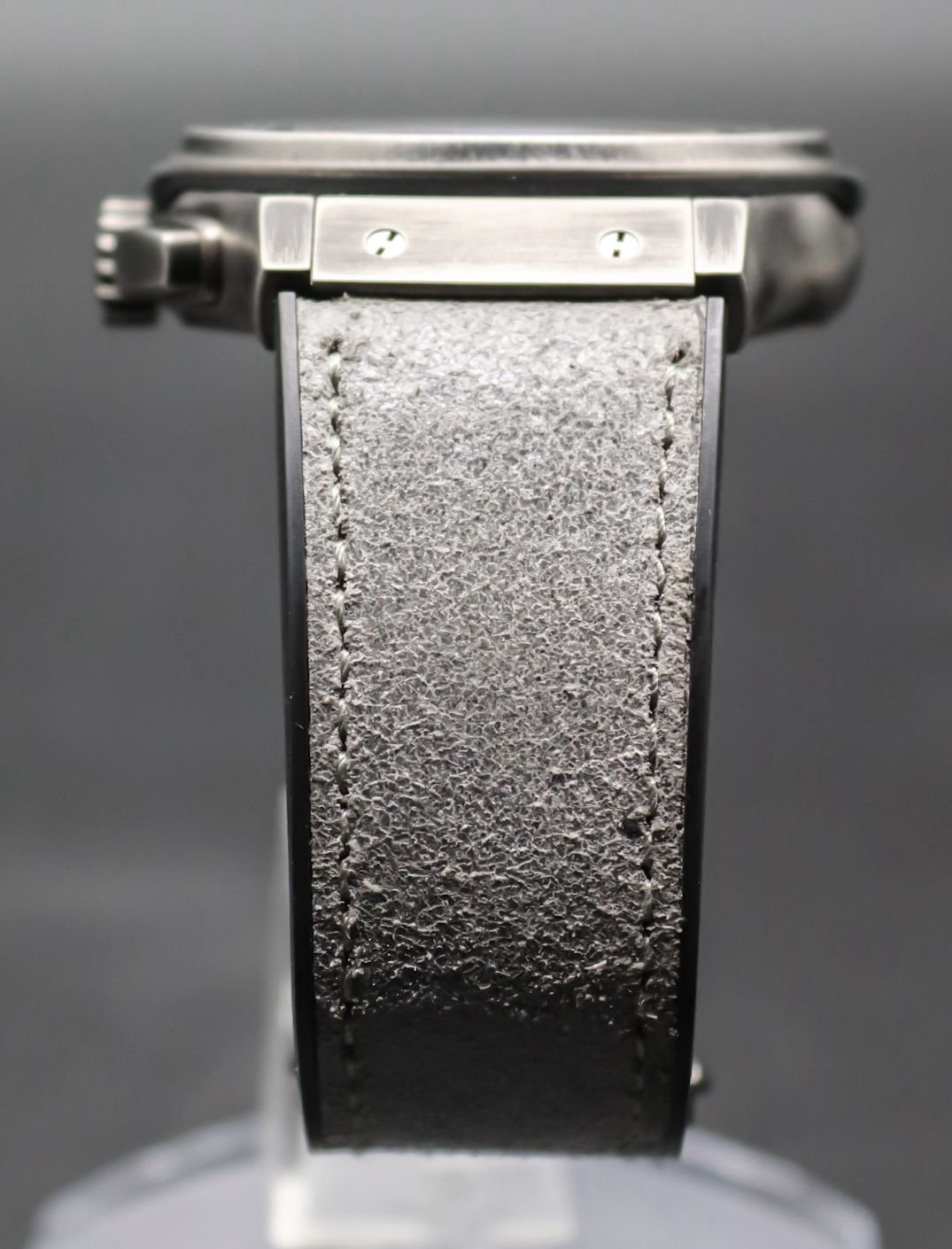 A chromatic choice of chiaroscuro which envelops the aesthetics of all the components of the watch, including the leather strap stitched onto black leather.