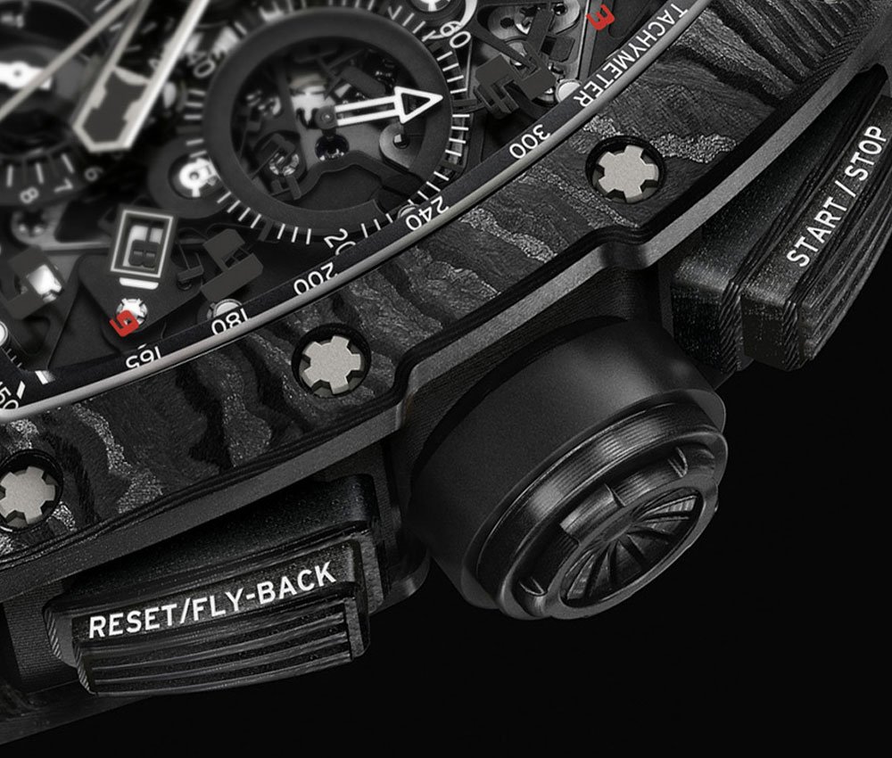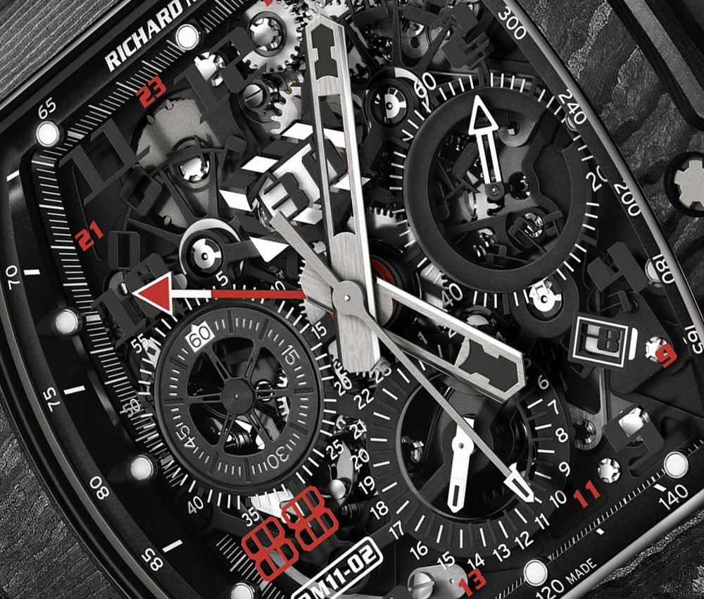 A rare Richard Mille RM 11‑02 Jet Black Limited Edition featuring a bold NTPT carbon case, skeleton dial, dual time zone flyback chronograph, and black rubber strap — blending technical sophistication with contemporary performance design.