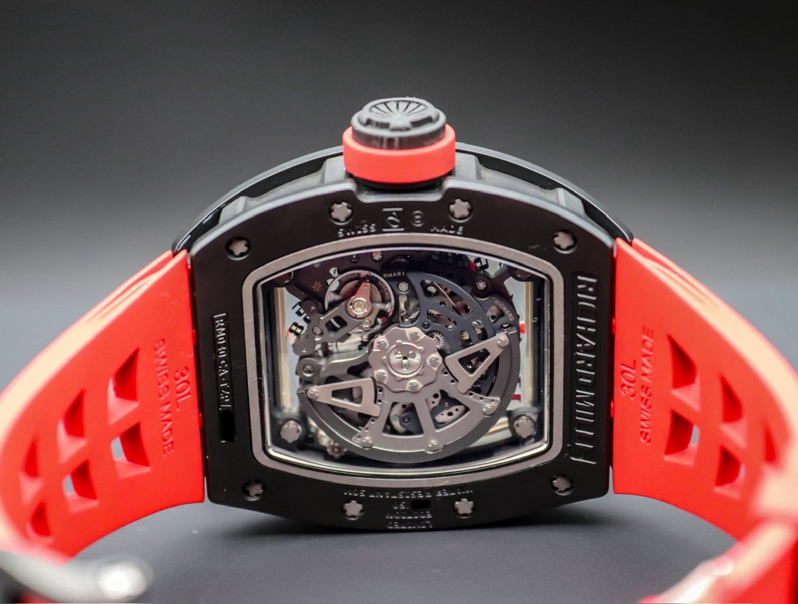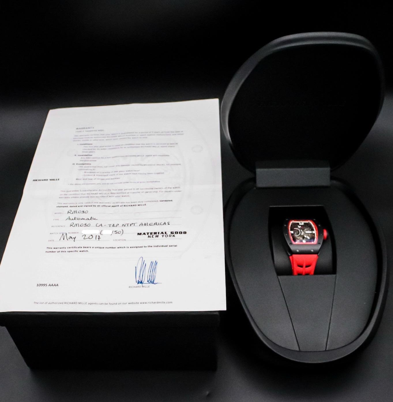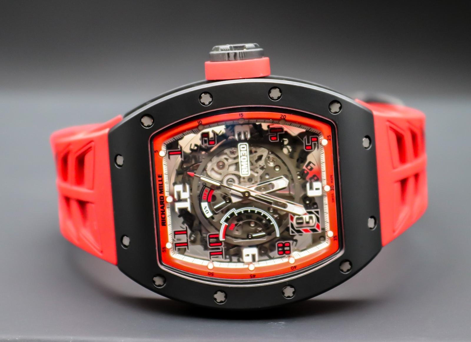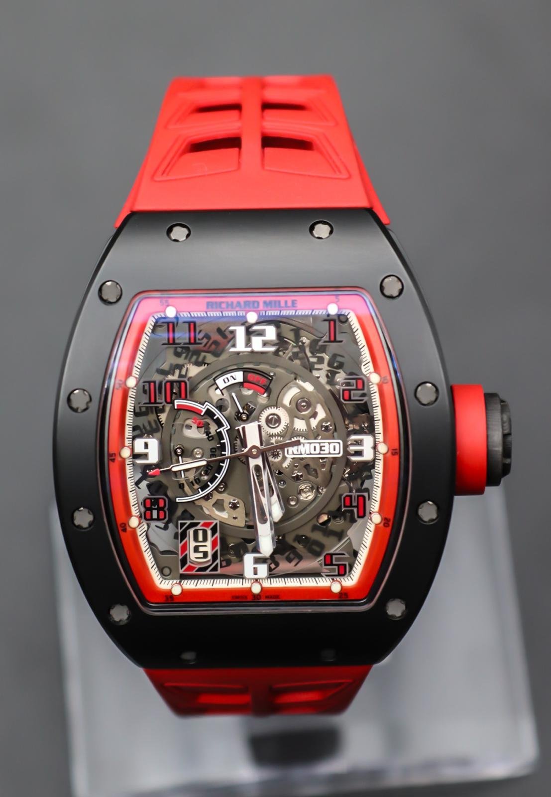 A rare, high‑octane take on the RM 030, this Americas‑exclusive pairs TZP black ceramic with NTPT Carbon for a case that’s ultra‑light, tough, and unmistakably RM. The skeletonized dial puts the engineering on full display, while the automatic movement features RM’s signature declutchable rotor to prevent overwinding—plus power‑reserve, winding on/off, and date displays. Red accents and strap deliver bold wrist presence. A collectible statement piece with everyday comfort and true RM DNA.