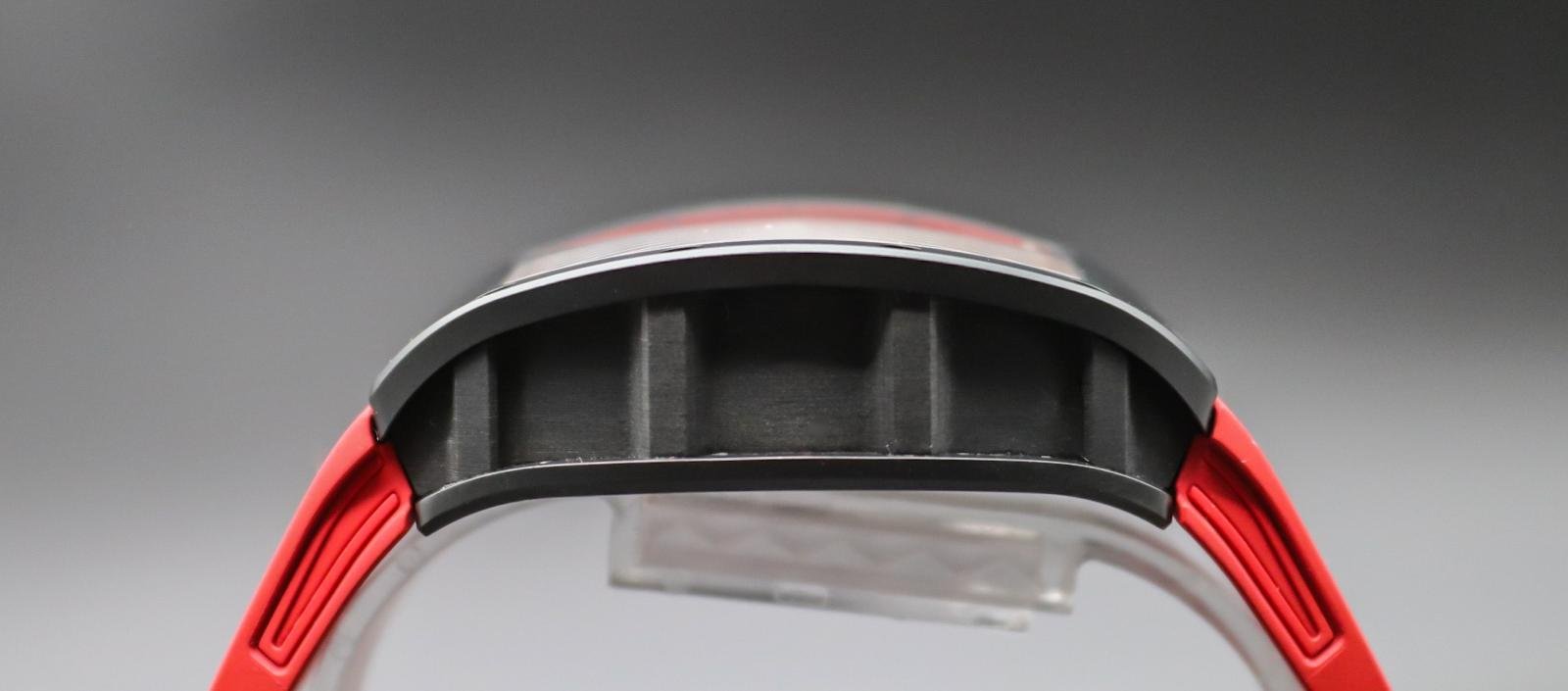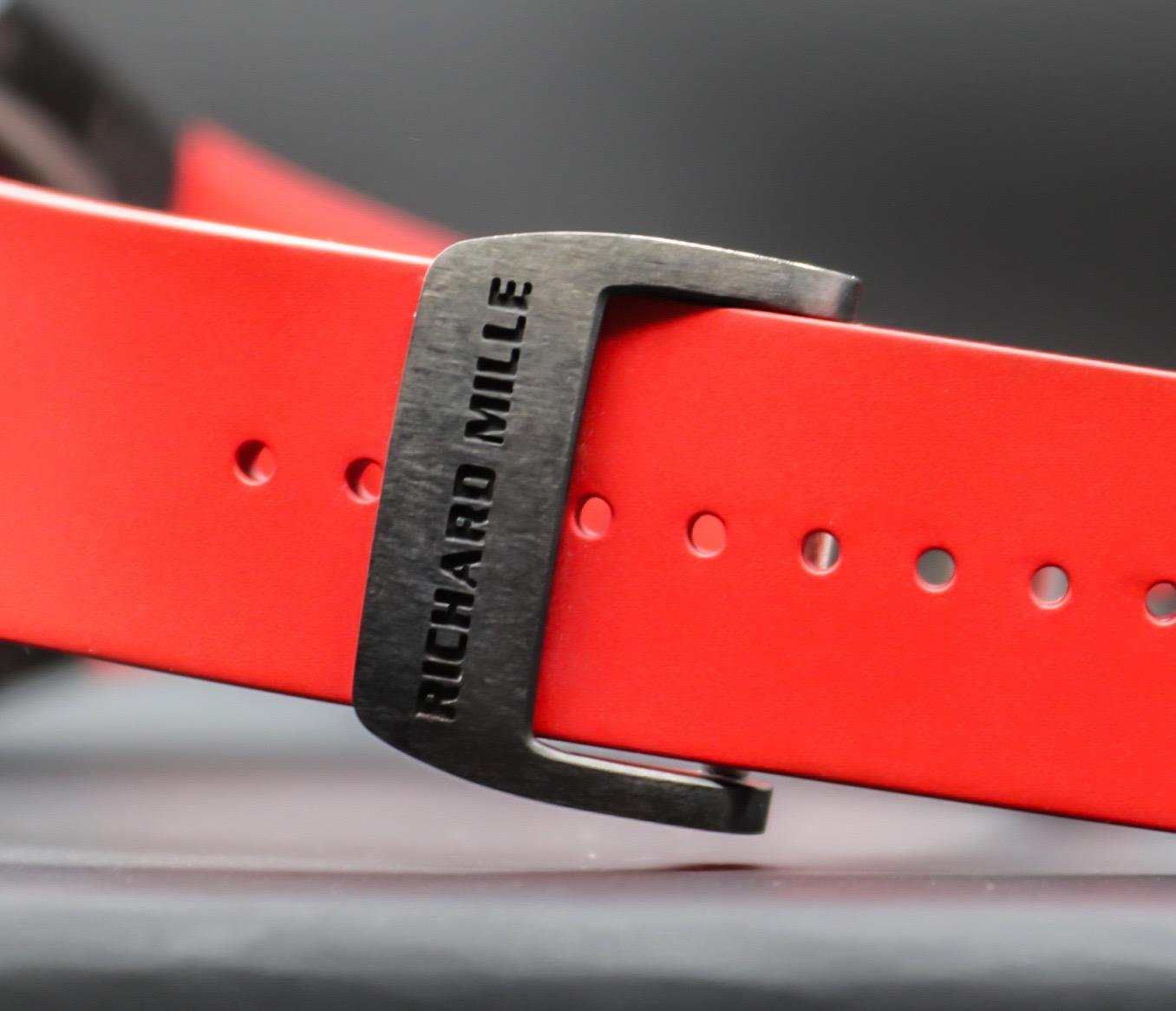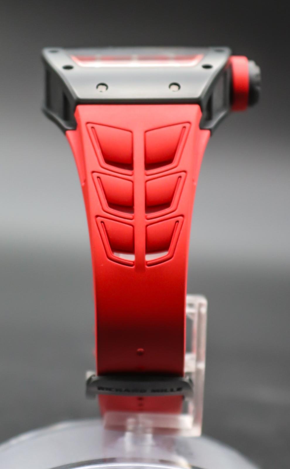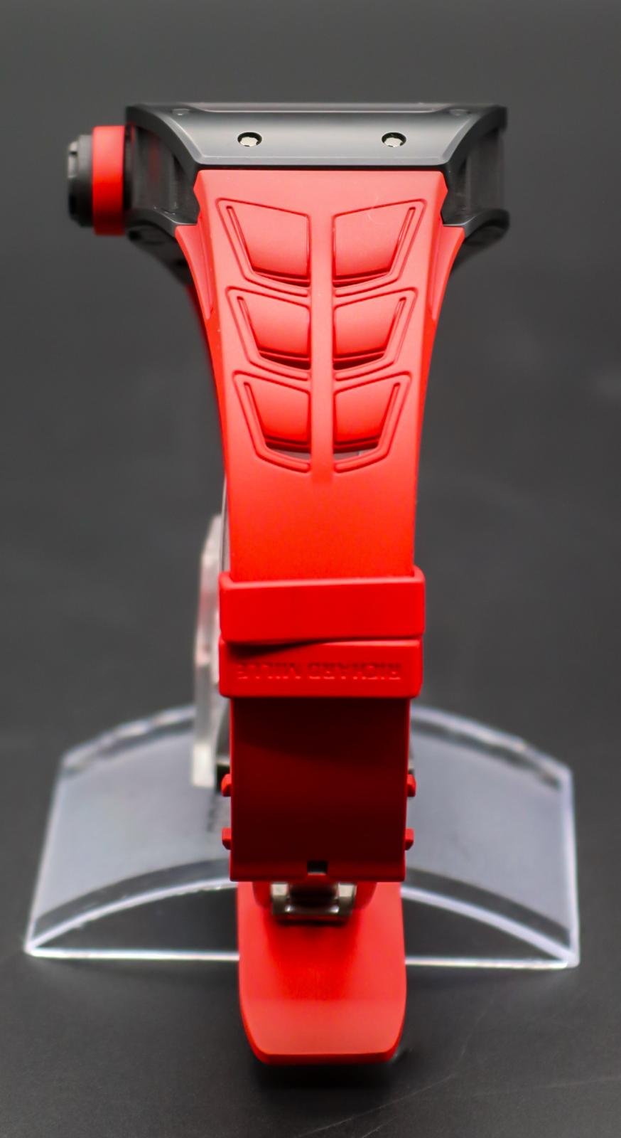 A rare, high‑octane take on the RM 030, this Americas‑exclusive pairs TZP black ceramic with NTPT Carbon for a case that’s ultra‑light, tough, and unmistakably RM. The skeletonized dial puts the engineering on full display, while the automatic movement features RM’s signature declutchable rotor to prevent overwinding—plus power‑reserve, winding on/off, and date displays. Red accents and strap deliver bold wrist presence. A collectible statement piece with everyday comfort and true RM DNA.